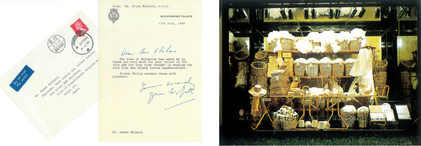 海島綿を英国から受け継いだ後も、日本は英国王室との歴史的なつながりに敬意を表し、1990年に260番手という超細番手を海島綿で紡出した際には、その糸で作られたハンカチをつくり、エジンバラ公に献上し感謝状をいただきました。